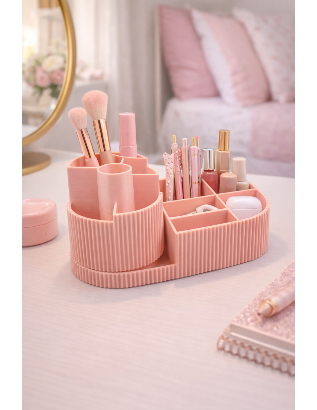 Elegant kosmetik organizer i lyserød med ribbet design og multiple rum – perfekt til makeup, børster og skønhedsprodukter.