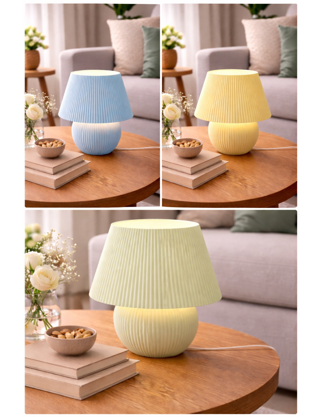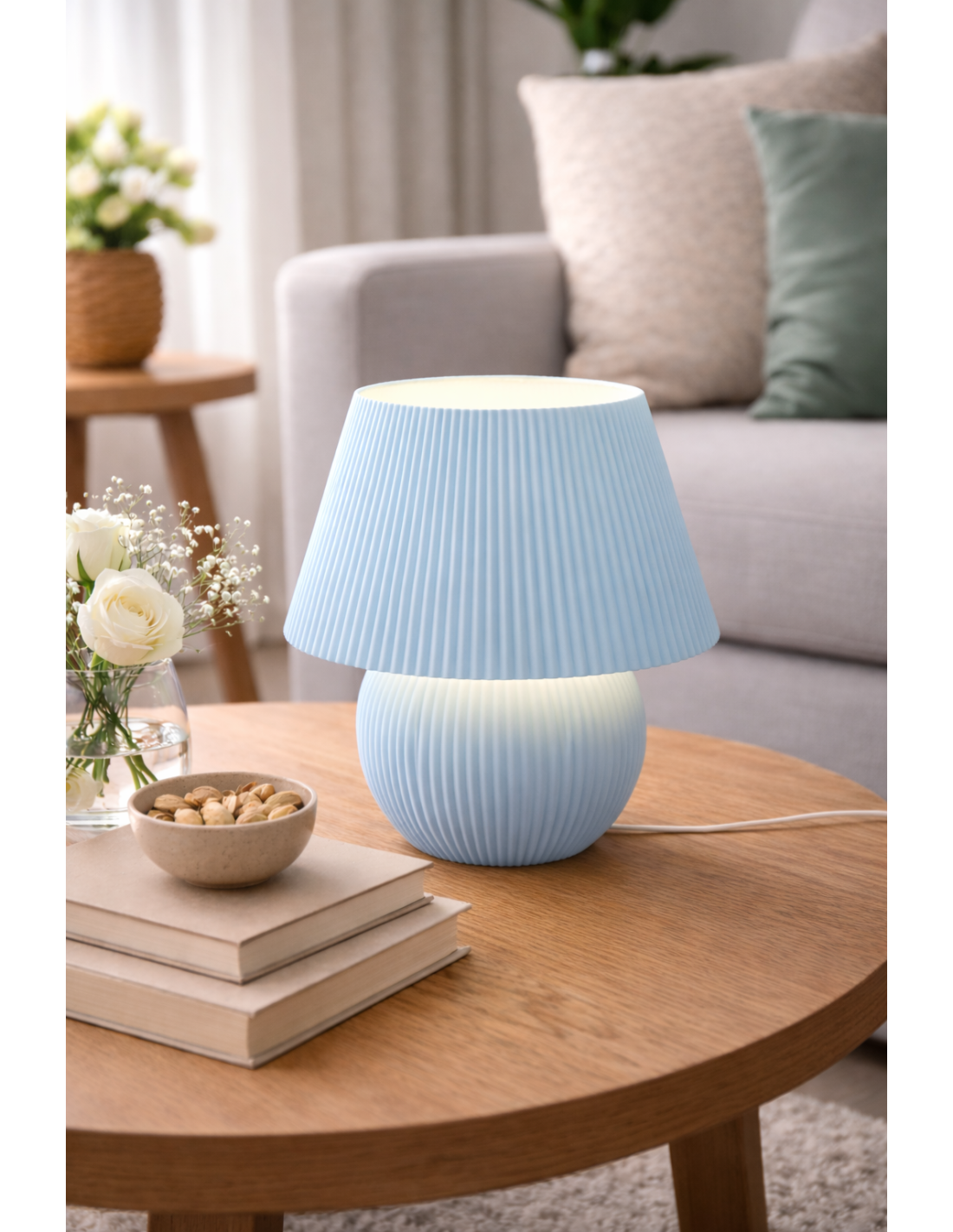 Denne elegante LED lampe i mintgrøn farve med ribbet design kombinerer moderne æstetik med smart funktionalitet. Med RGB farveskift, fjernbetjening og USB tilslutning er den perfekt stemningsbelysning til ethvert rum.