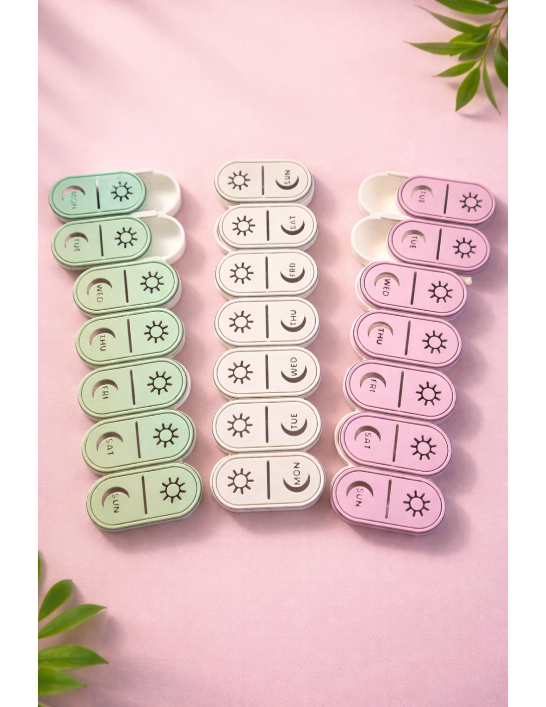 Praktisk ugentlig pilleboks med 14 rum – morgen og aften for alle ugens dage. Fås i grøn, beige og lyserød.