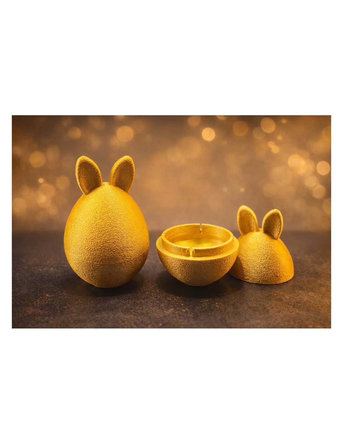 3D Printet Påskehare-Æg i guld med ører (12 cm) er en dekorativ og unik figur, der passer perfekt som påskepynt eller som en lille gaveidé. Modellen er 3D-printet med flot struktur og en elegant guld-finish, som giver et eksklusivt udtryk i hjemmet.
