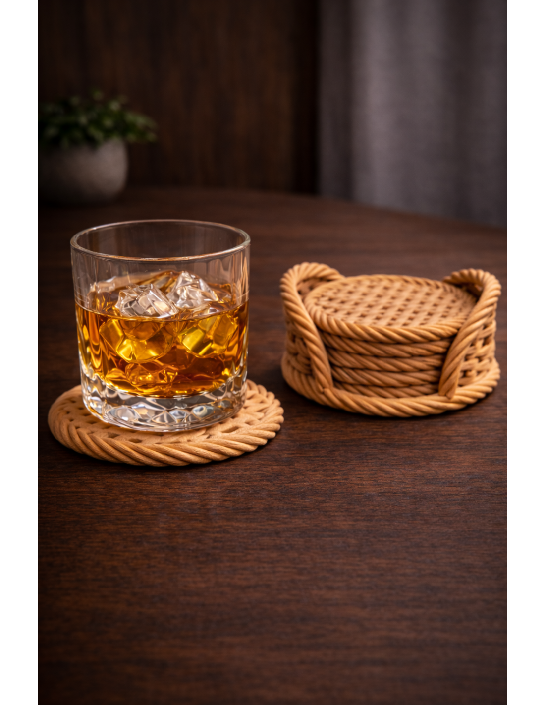 Elegant 5-pack drink coaster in a braided design with a practical holder – 100% waterproof PLA protects the table perfectly.