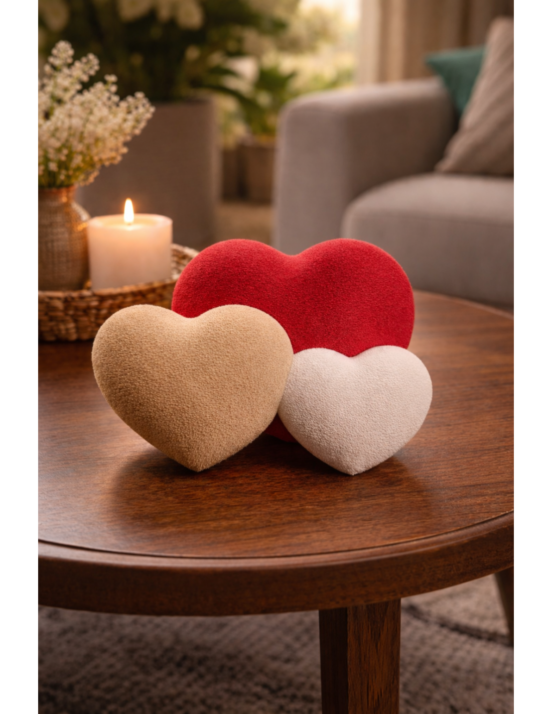Decorative Hearts Set of 3 Pieces – Fuzzy Texture White Red Beige
