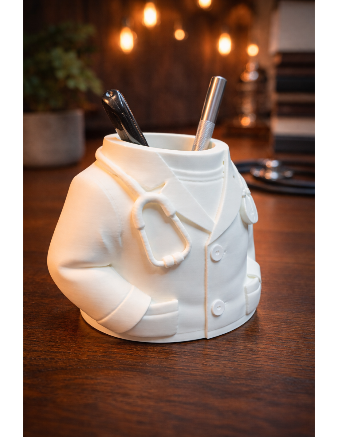 Elegant doctor pen holder shaped like a doctor's jacket in white with stethoscope details – perfect gift for doctors and medical staff.