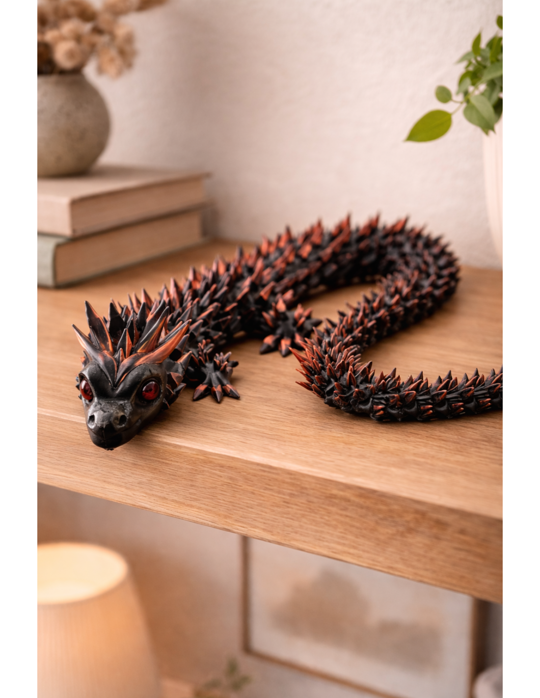 This stunning flexible dragon in black with orange spikes is a unique decoration that attracts all eyes. With its impressive length of 45cm and the detailed pointed spikes along the entire body, it is perfect as a decoration in the home or as a special gift.
