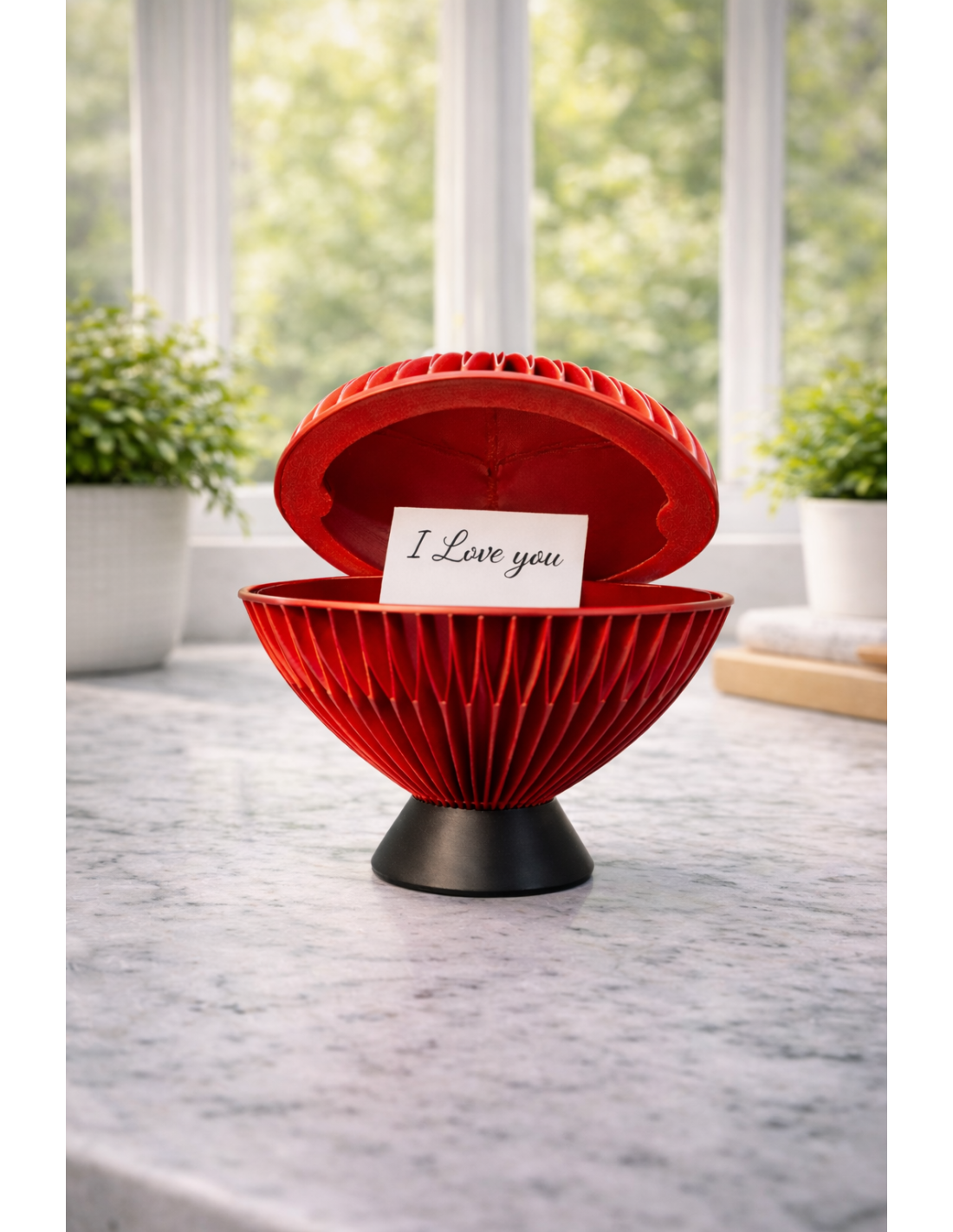 The elegant ribbed design gives the box a modern and sculptural look, while the classic heart shape symbolises love. The red colour is timeless and romantic, and the black base provides a stable and elegant contrast.