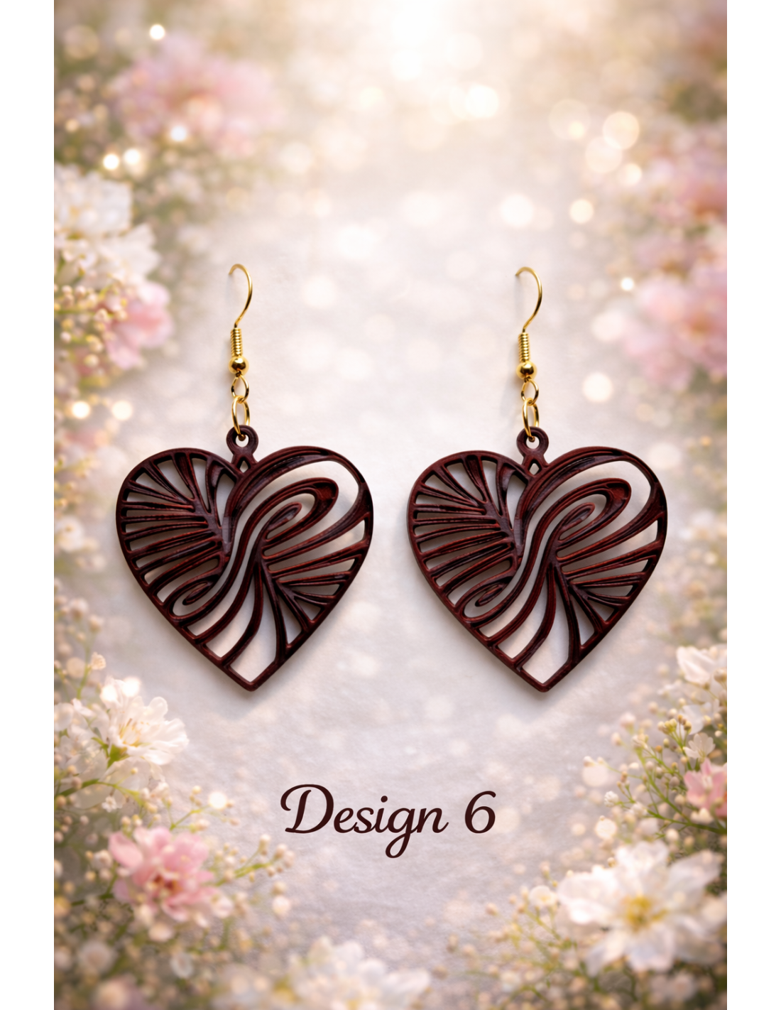 Elegant 3D printed earrings in mahogany wood finish with 9 unique designs – light, beautiful and hypoallergenic jewelry.