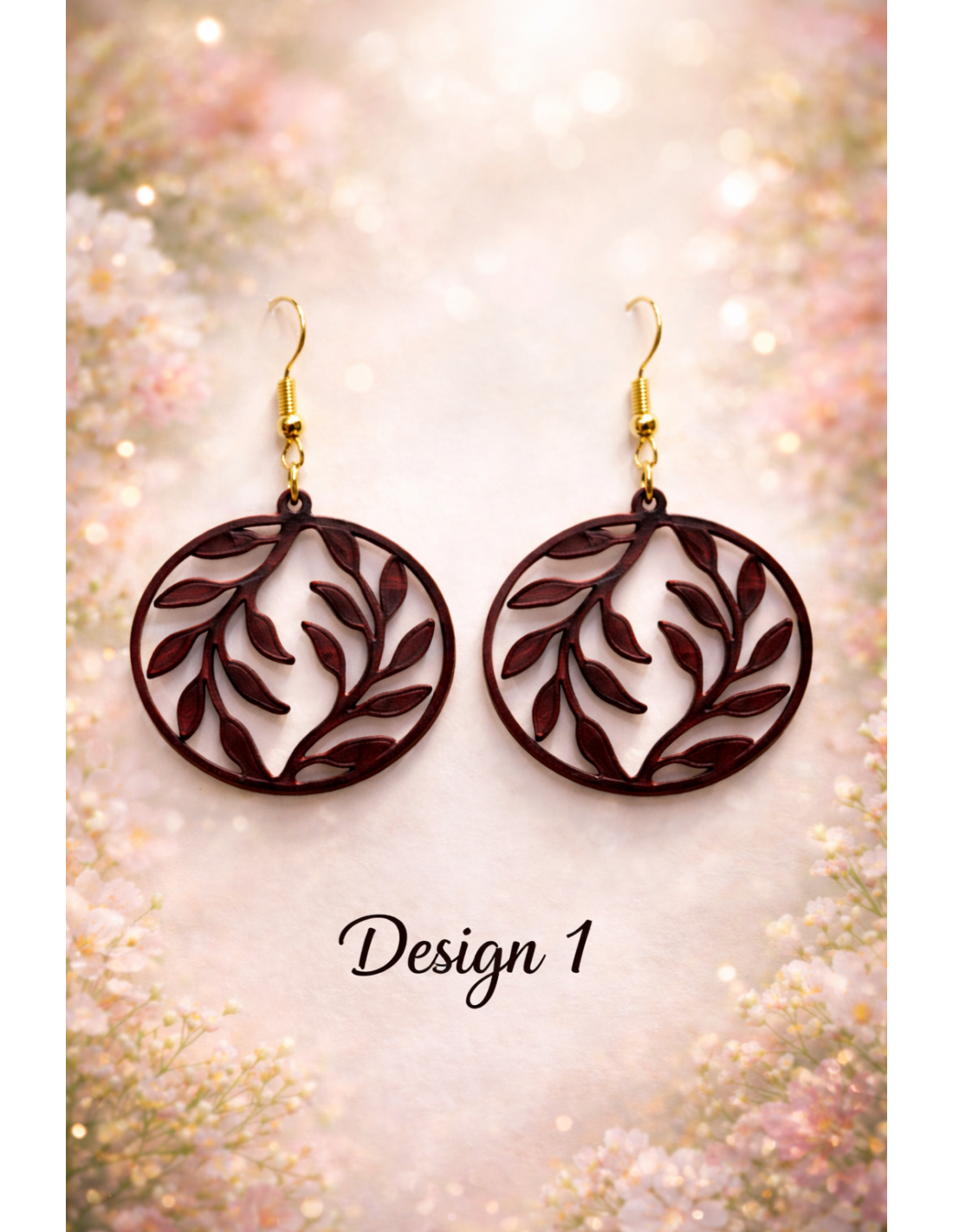 These elegant 3D printed earrings combine modern technology with timeless beauty. With their beautiful mahogany wood finish and gold-tone fittings, they are available in 9 different artistic designs – from botanical patterns to geometric shapes.