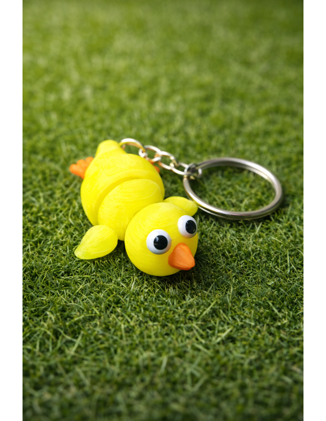 Fun neon yellow 3D-printed chicken keyring with big eyes and a beak that is flexible.