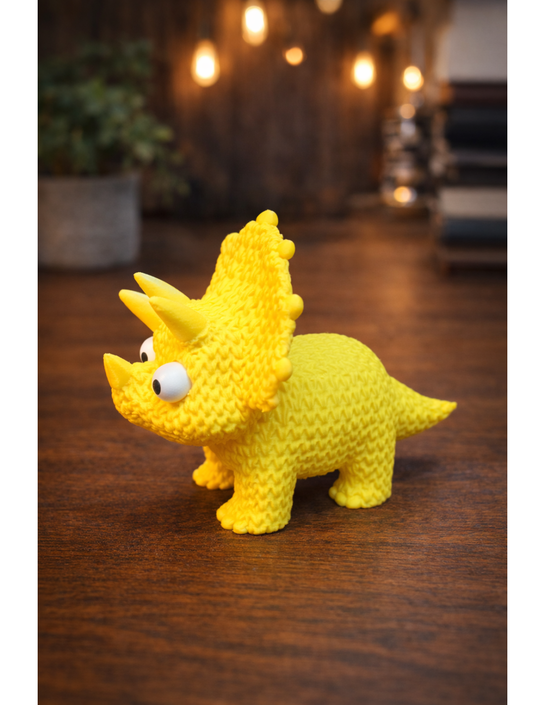This irresistibly cute dinosaur figure in bright yellow color brings smiles and joy wherever it stands. With its charming googly eyes and friendly expression, this little triceratops is perfect as a decoration, toy or gift for dinosaur enthusiasts of all ages.