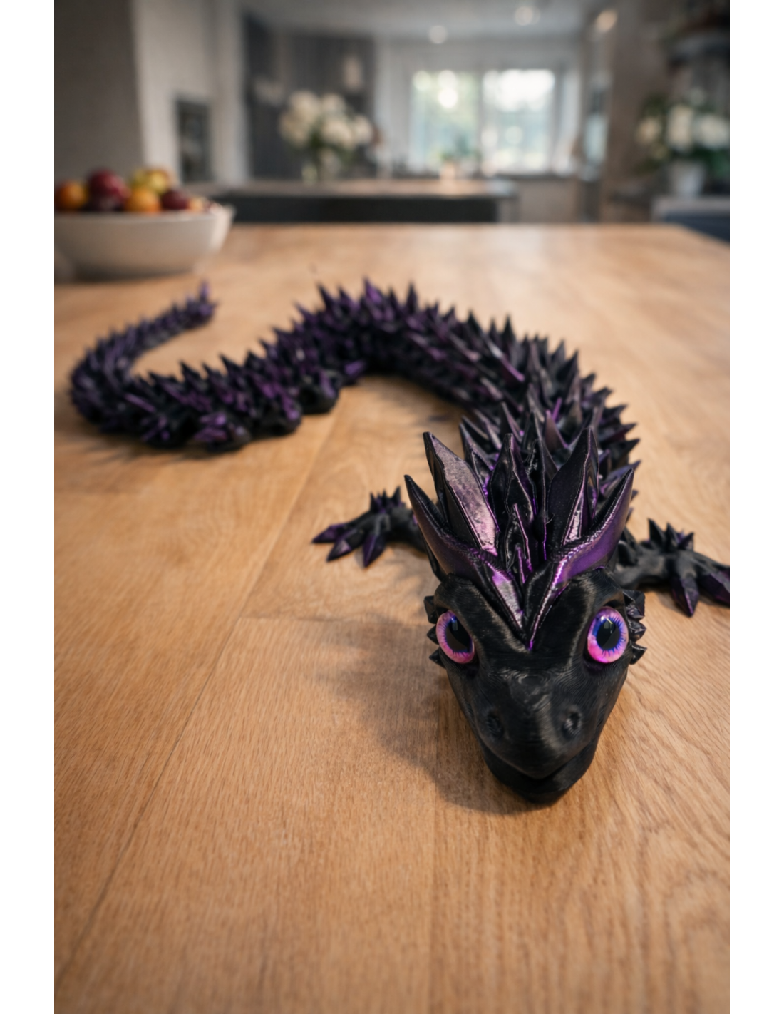 This spectacular flexible kite in 45 cm is a true masterpiece of 3D printing technology. With its dramatic black color and eye-catching purple/pink accents, this articulated dragon is perfect as a fidget toy, decoration, or collectible item for fantasy lovers.