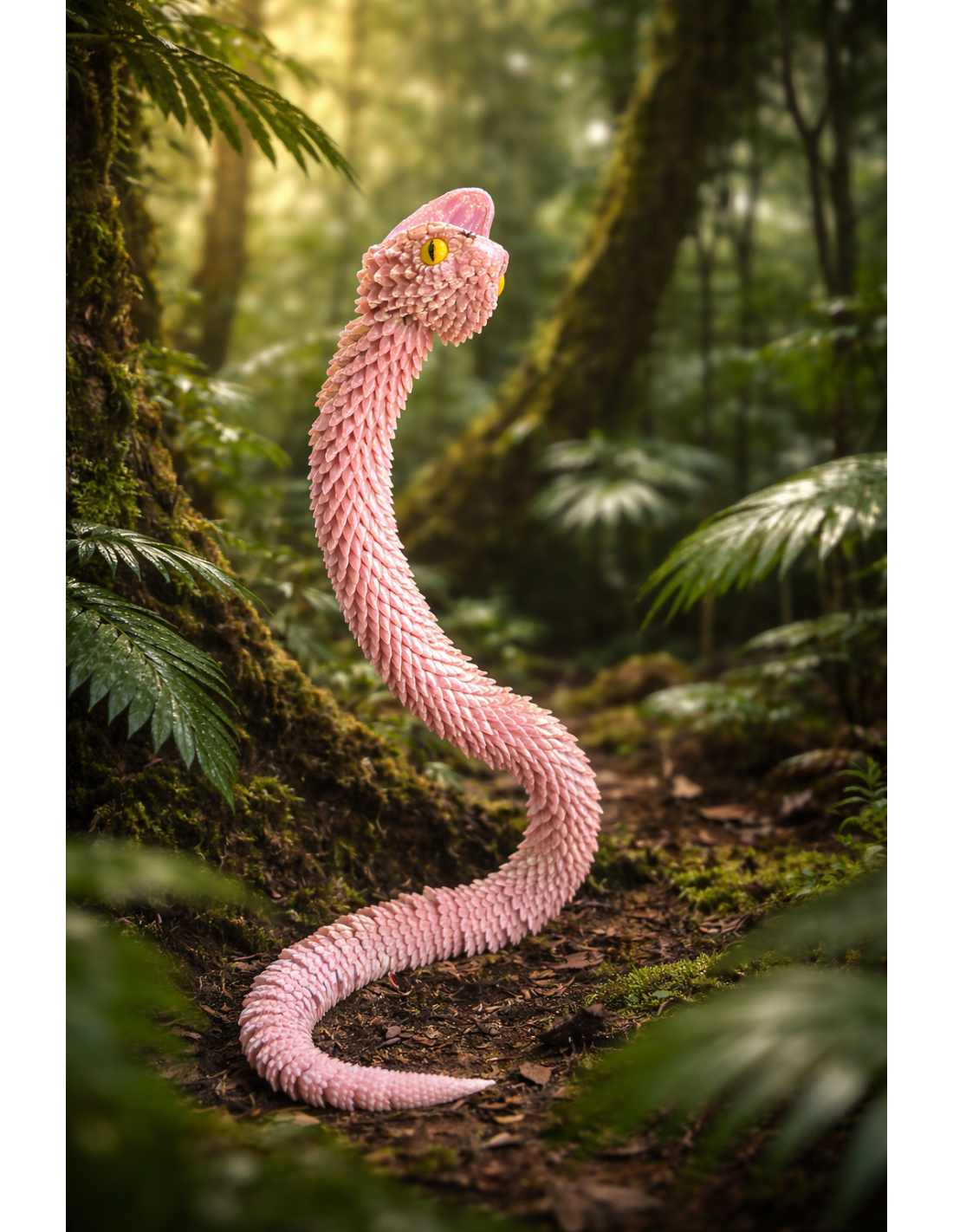 - Farve: Lyserød med gule øjne for et levende udtryk