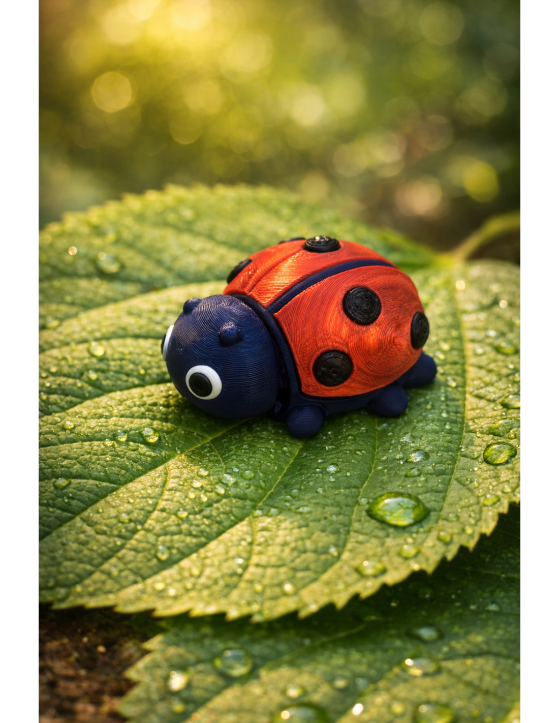 Bemærk: Da produktet er 3D-printet, kan små variationer i finish og farveaccenter forekomme. Hver mariehøne er unik. Print-linjer er synlige og normalt for 3D-printede produkter, hvilket tilføjer til den håndlavede karakter.