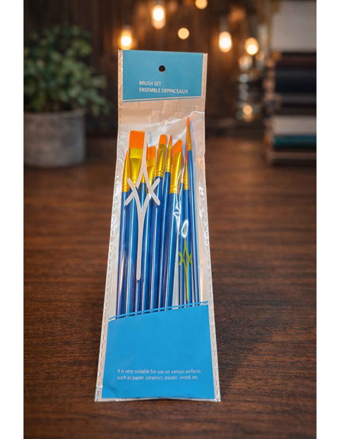 Dette penselsæt indeholder 10 pensler i forskellige størrelser med elegant blå skaft og orange/gule børster. Sættet dækker alle dine malebehov - fra de fineste detaljer til større flader.