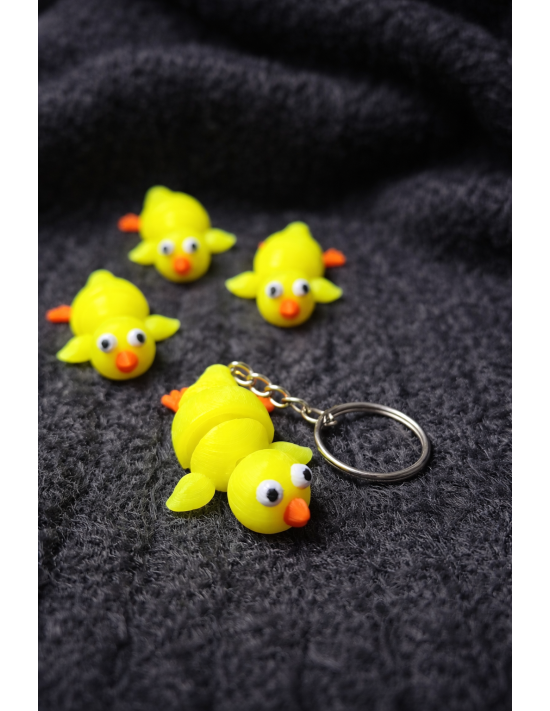 Sjov neon gul 3D-printet kylling nøglering med store øjne og næb der er fleksibel.