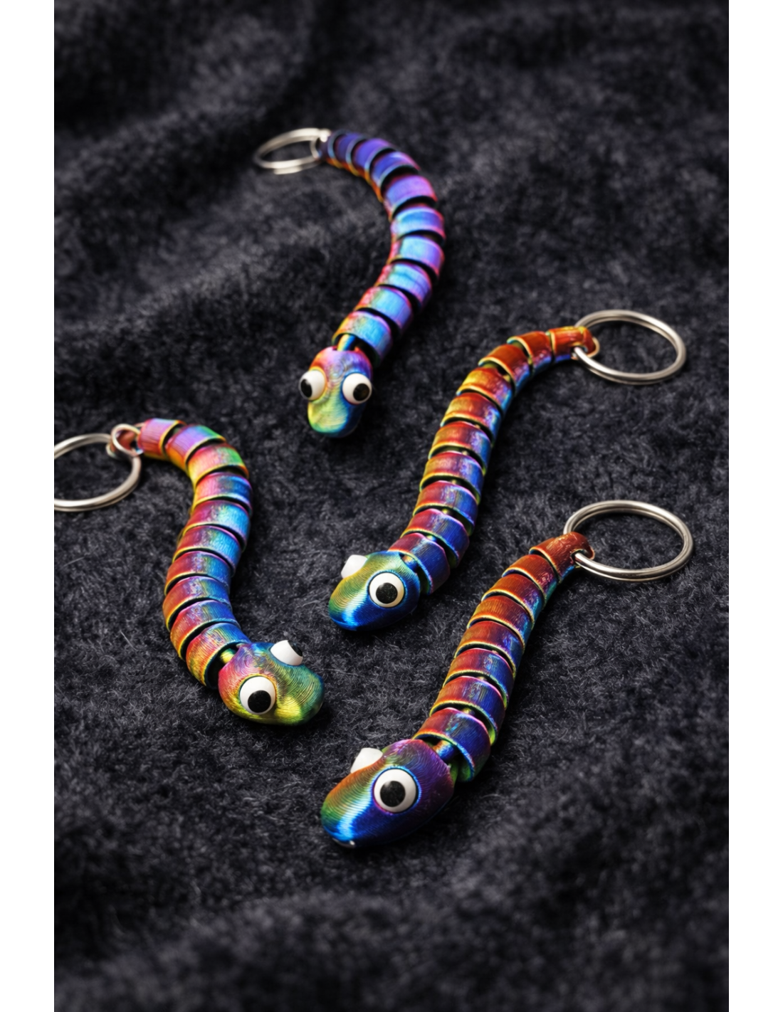 Skil dig ud med denne 3D printede slange nøglering i flotte rainbow-farver. Den har et sjovt og charmerende udtryk, og den fleksible, segmenterede krop gør den ekstra underholdende at have med på farten.
