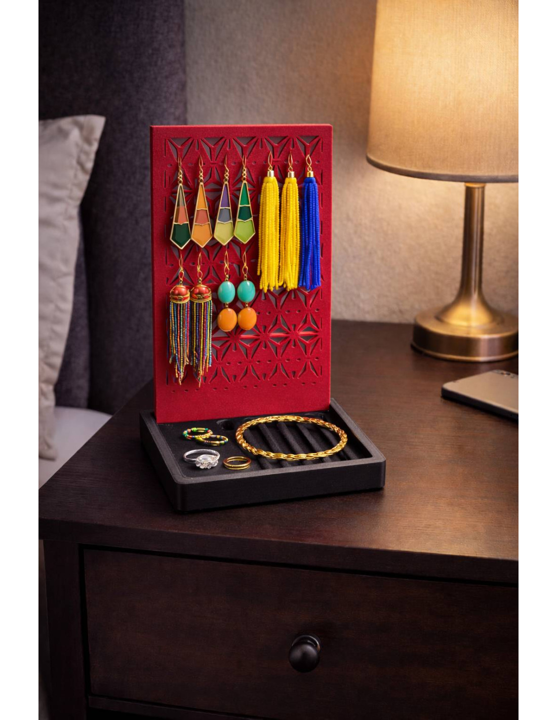 Denne smykkeholder er designet som en samlet enhed med en lodret plade til øreringe og en bakke nederst til armbånd, kæder og småting. Du får hurtigt overblik og undgår sammenfiltrede smykker.